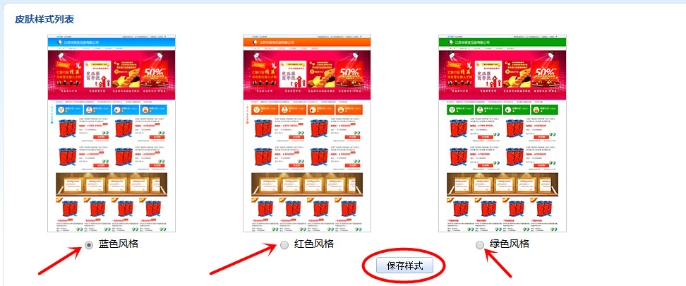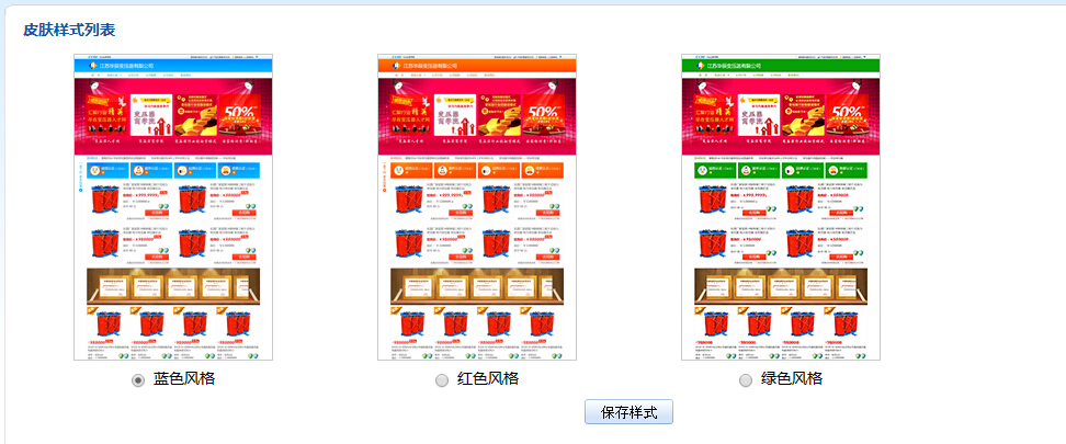 如果要选择不同的皮肤样式风格,只需要选中图片下面的单选框按钮即可,选中后空心单选框会变成实心单选框,如上图的“蓝色风格”,选中后点击“保存样式”按钮即可成功保存当前皮肤样式,回到首页面刷新后即可看见皮肤样式已经更新成您编辑后的皮肤样式了。