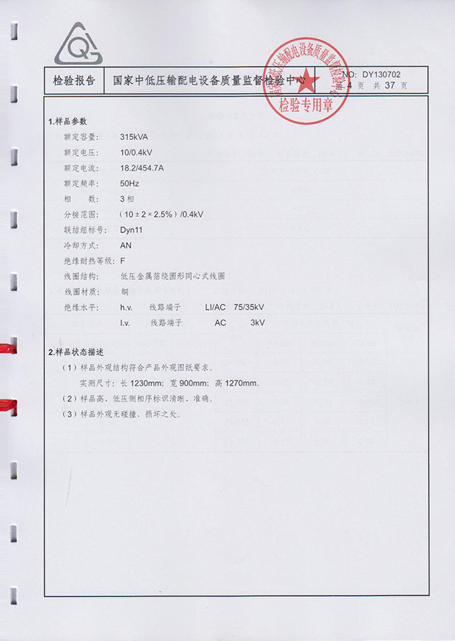 分接范围:(10±2×2.5%)/0.4kV 联结组标号 Dyn11 冷却方式:AN 绝缘耐热等级:F